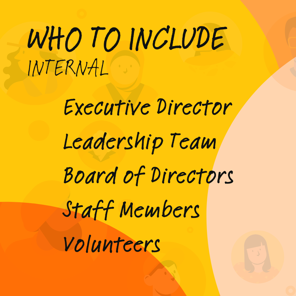 Internal stakeholders are the group that you will invite to be part of making meaning of the information gathered during the listening tour. Staff and the board at a minimum should be a part of the sessions. Exactly how many people can effectively be involved will depend on the skill and capacity of your facilitator(s). Larger groups can be effectively facilitated with larger facilitation teams and more technology support.